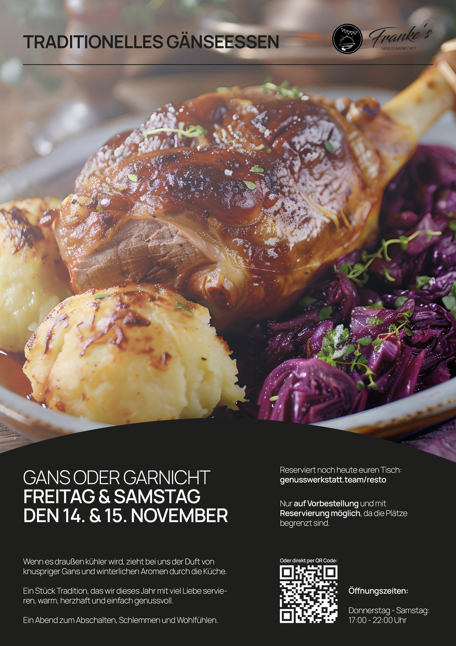Wenn es draußen kühler wird, zieht bei uns der Duft von knuspriger Gans und winterlichen Aromen durch die Küche. Ein Stück Tradition, das wir dieses Jahr mit viel Liebe servieren, warm, herzhaft und einfach genussvoll. Ein Abend zum Abschalten, Schlemmen und Wohlfühlen.